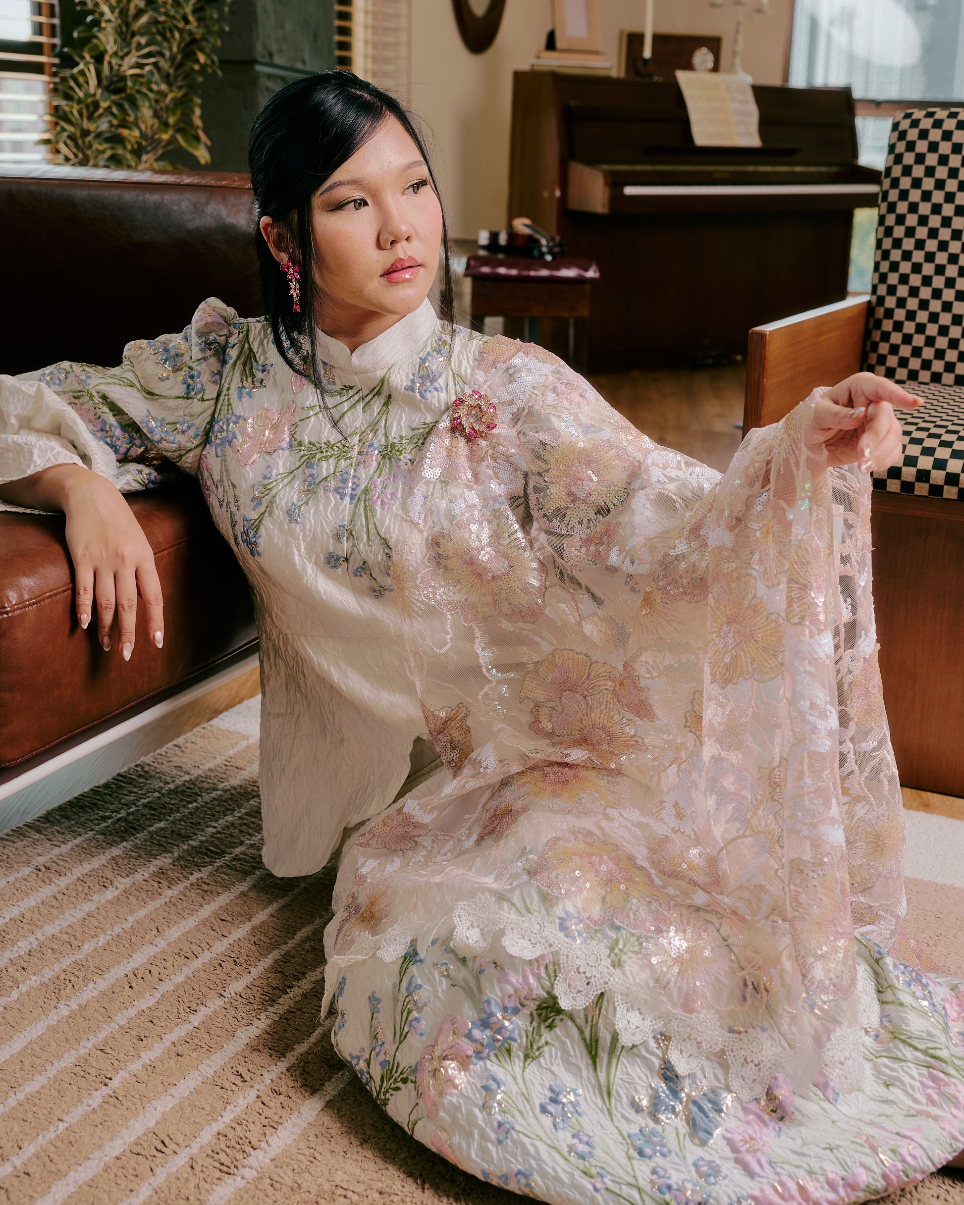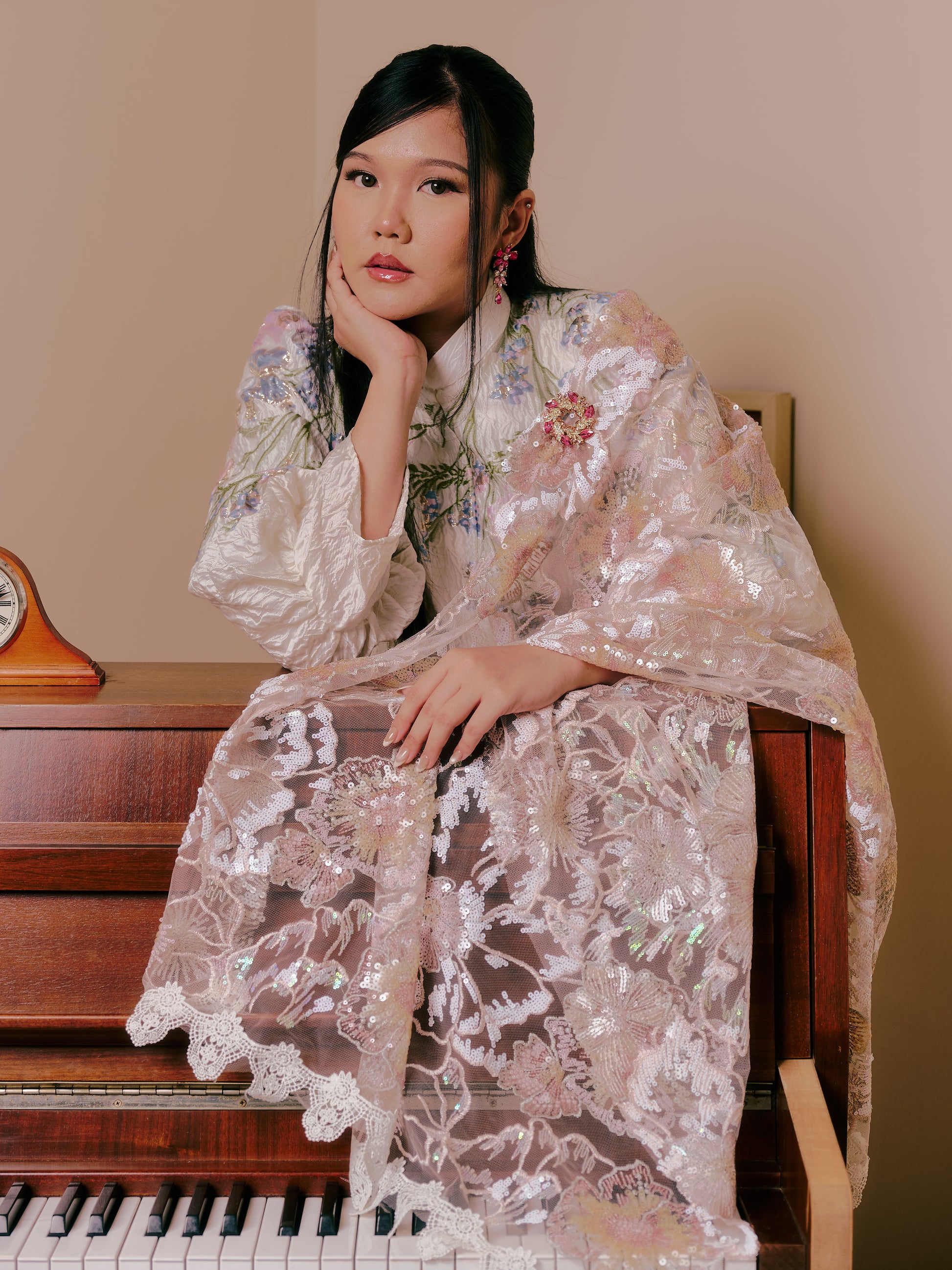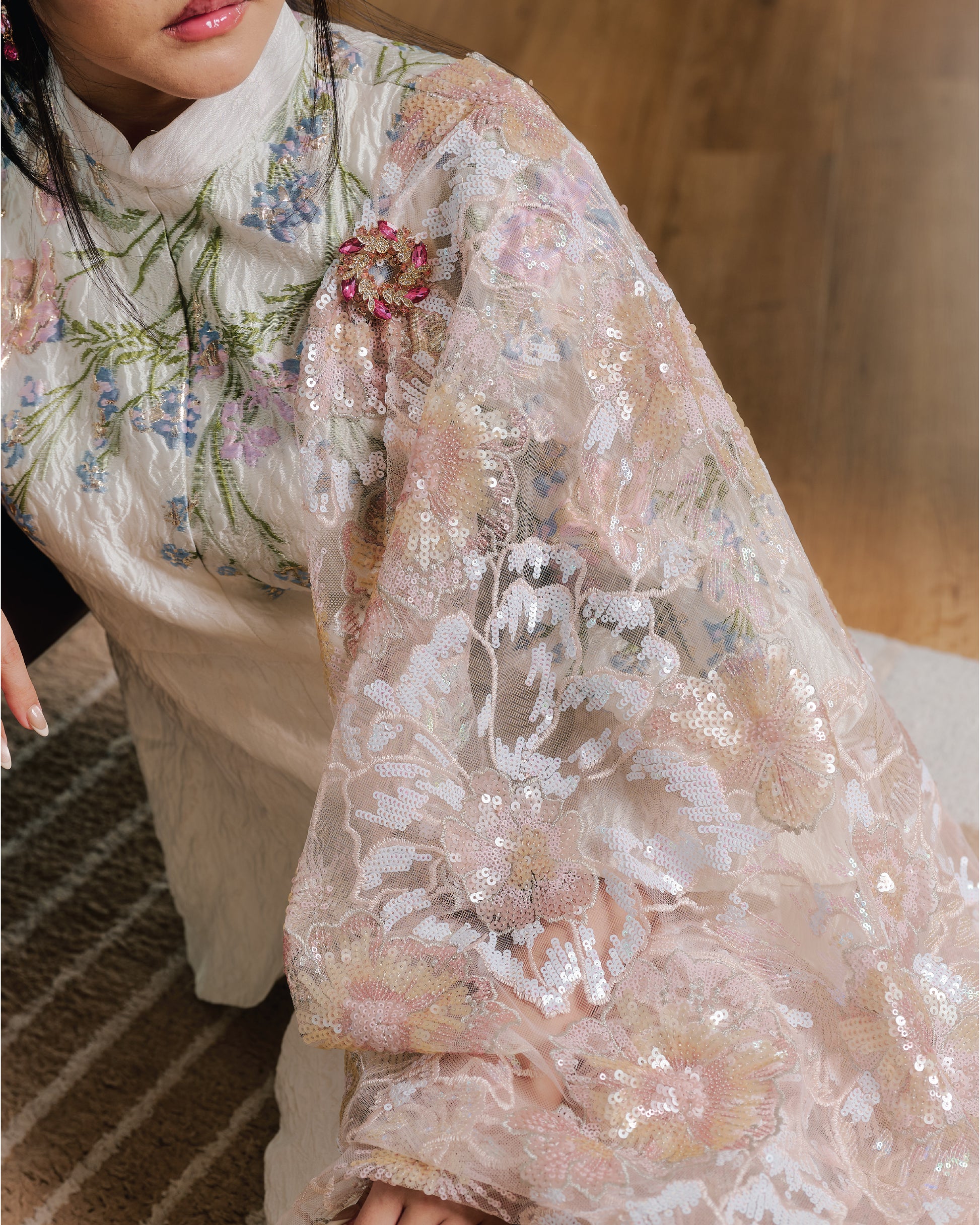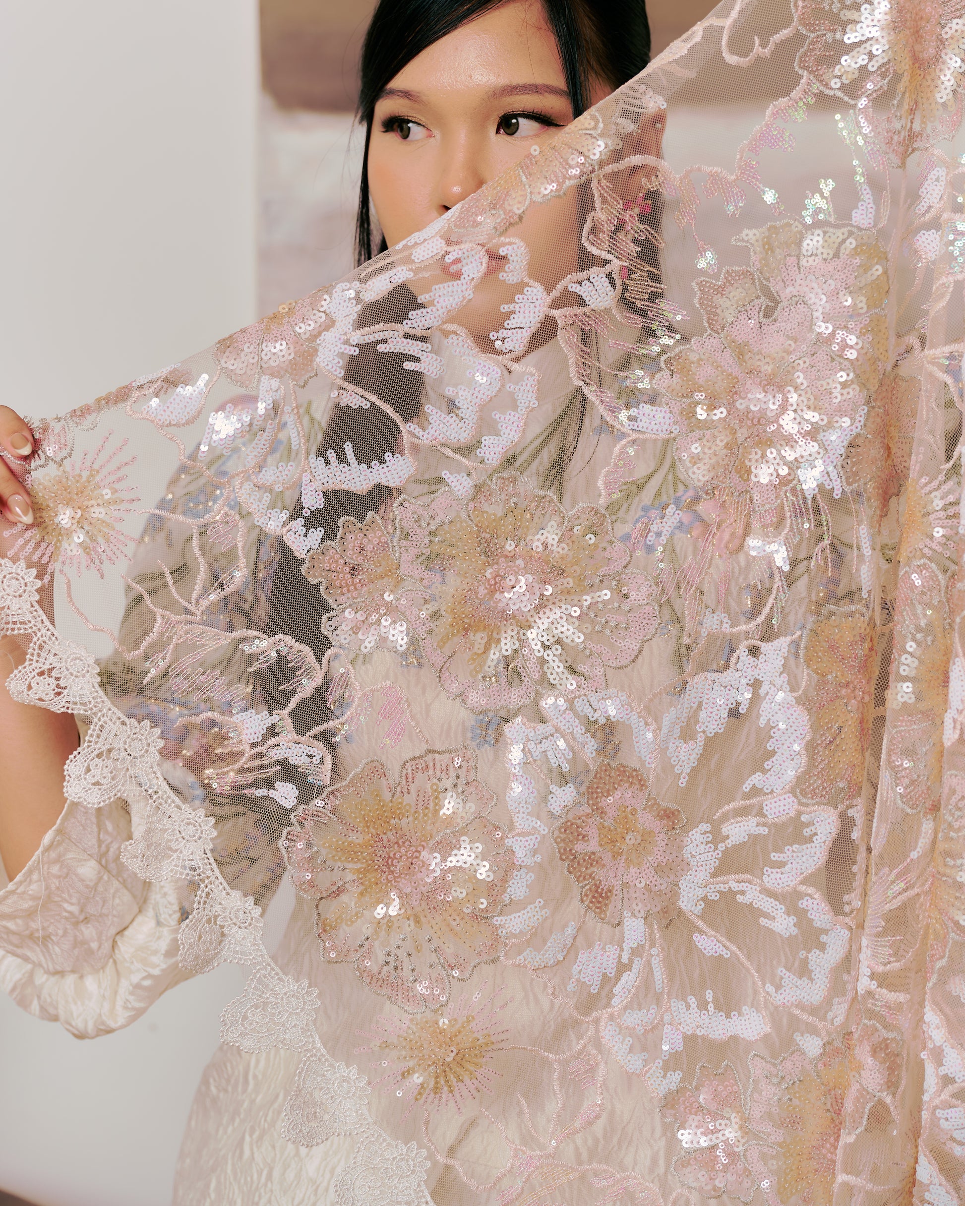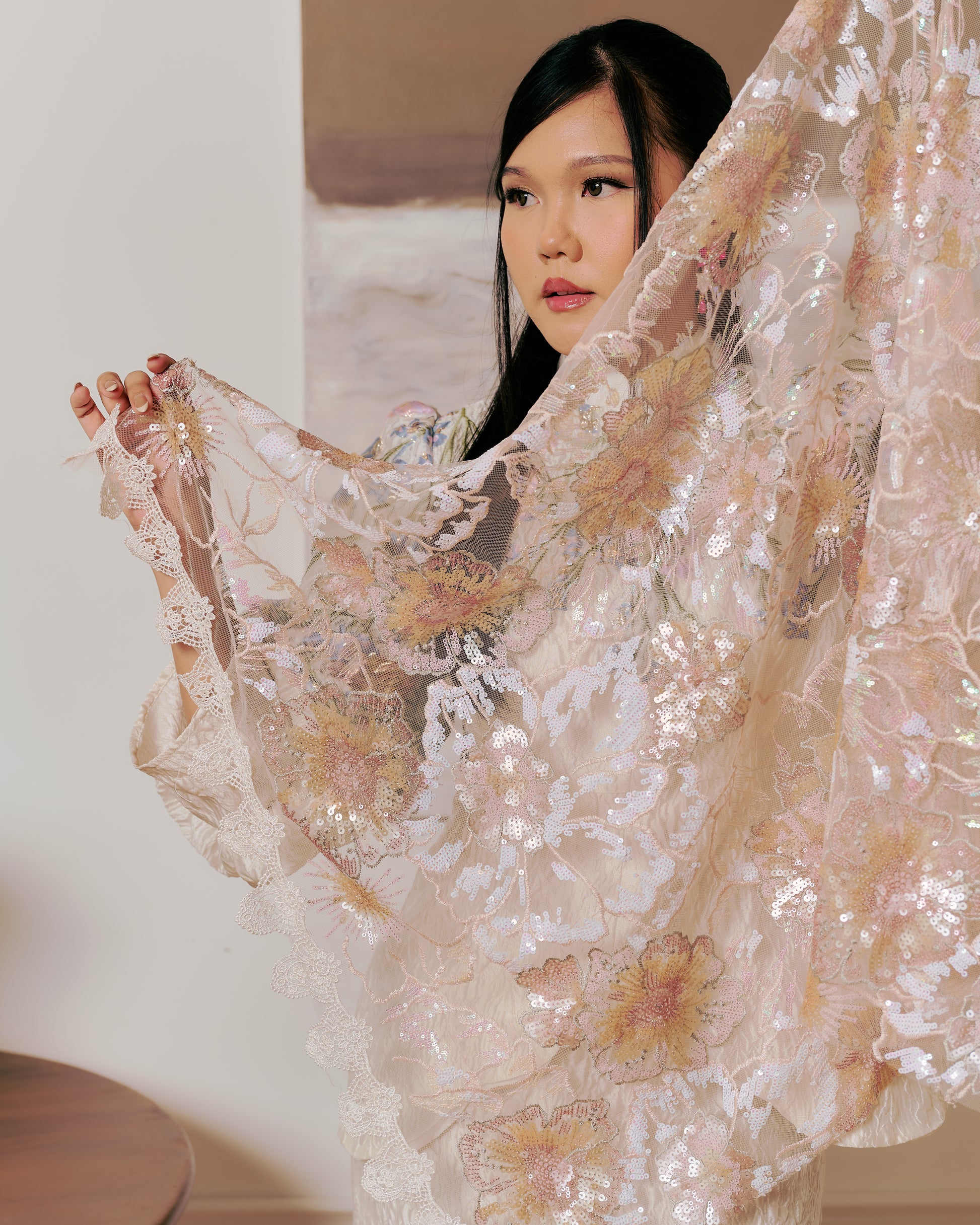 A selendang that feels like a gentle whisper of elegance. Bunga’s intricate sequin & embroidery hem edges features pastel blooms in blush and ivory tones. Exceptionally lightweight, it drapes effortlessly over the shoulders, adding a romantic, graceful touch. The subtle sparkle make it perfect for special occasions, whether paired with a classic kurung or a modern silhouette.