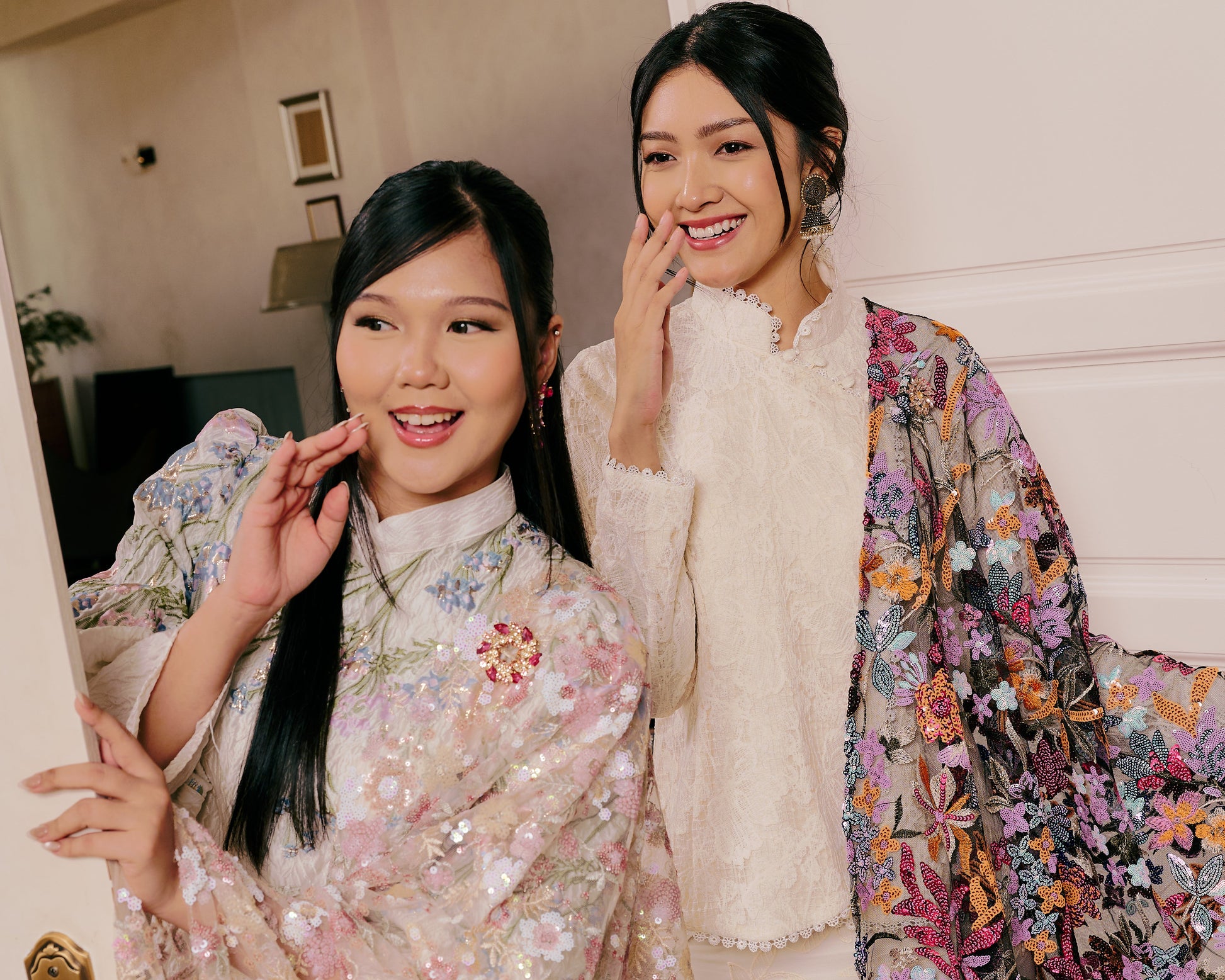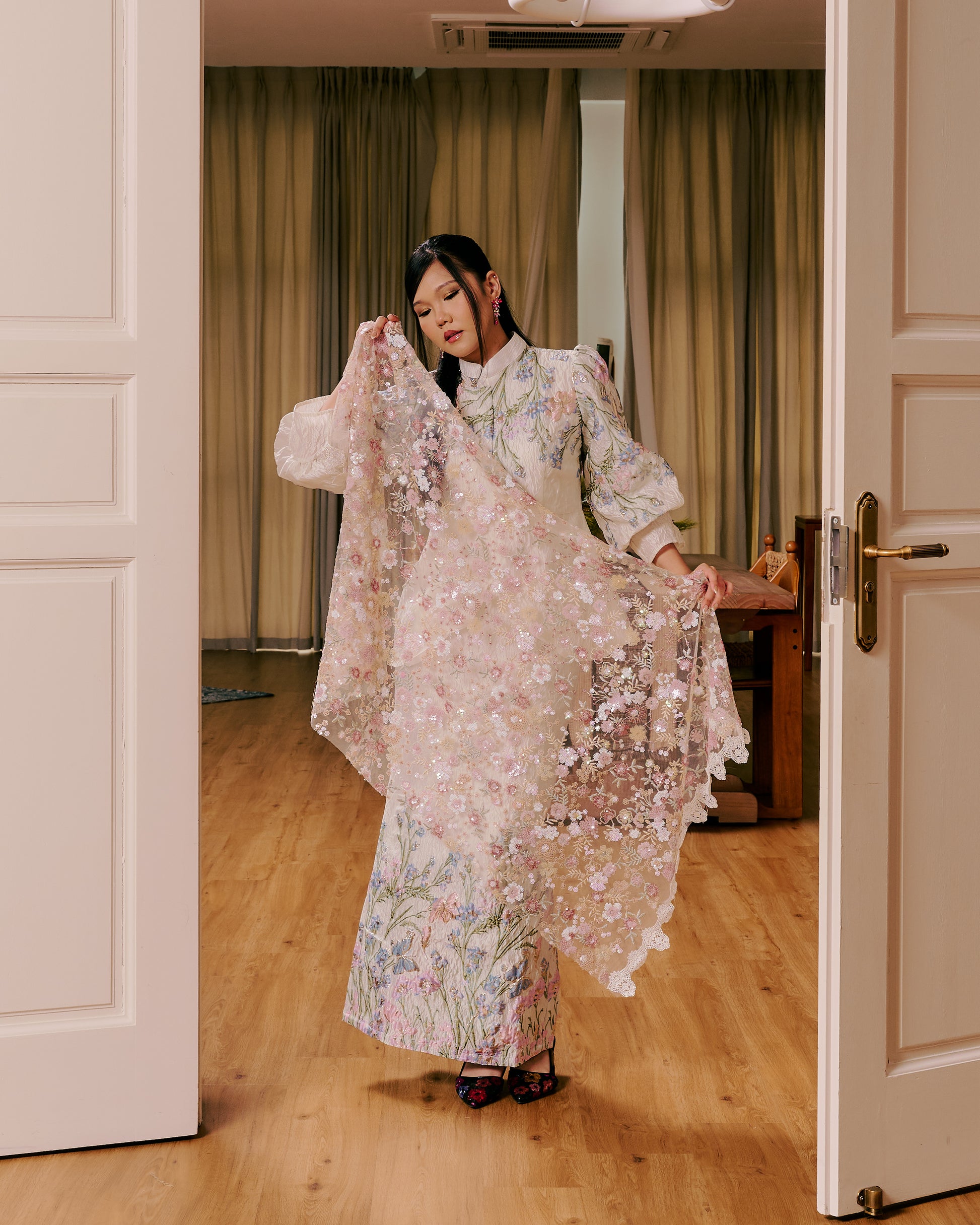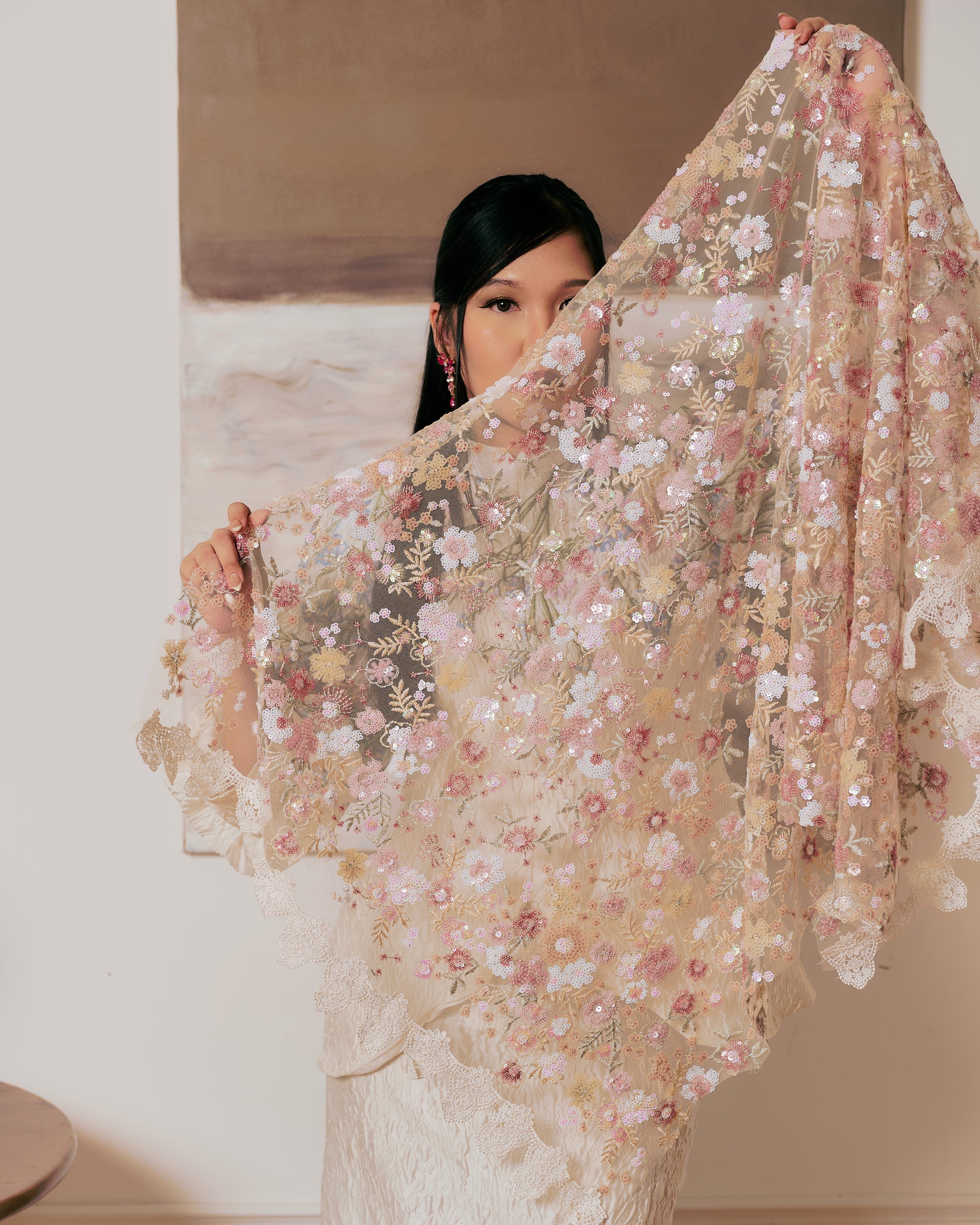 The dense, all-over detailing gives this selendang a refined weight and presence, instantly elevating even the simplest outfit. It drapes softly while offering that subtle statement sparkle — perfect for Eid gatherings, weddings, and special evenings.