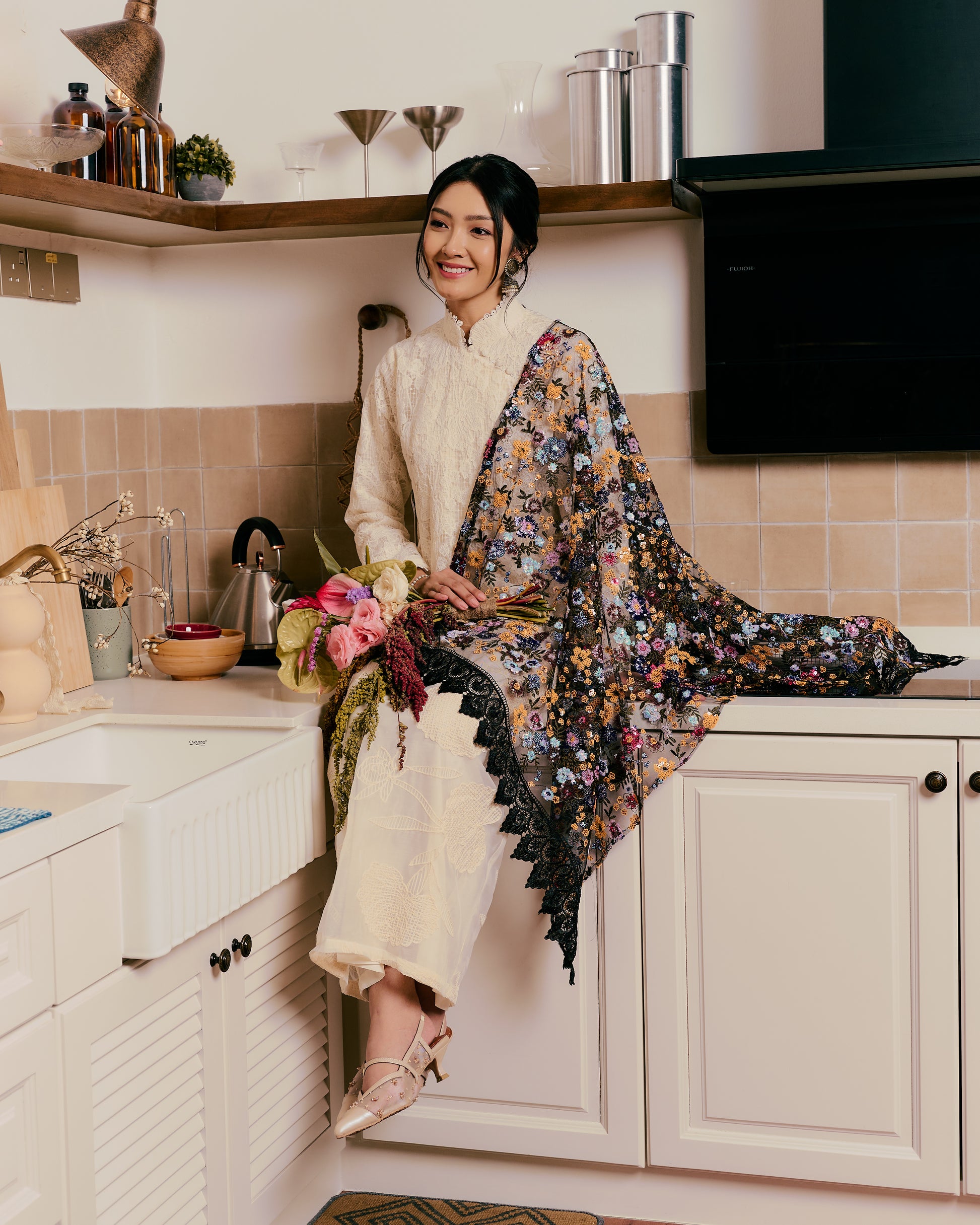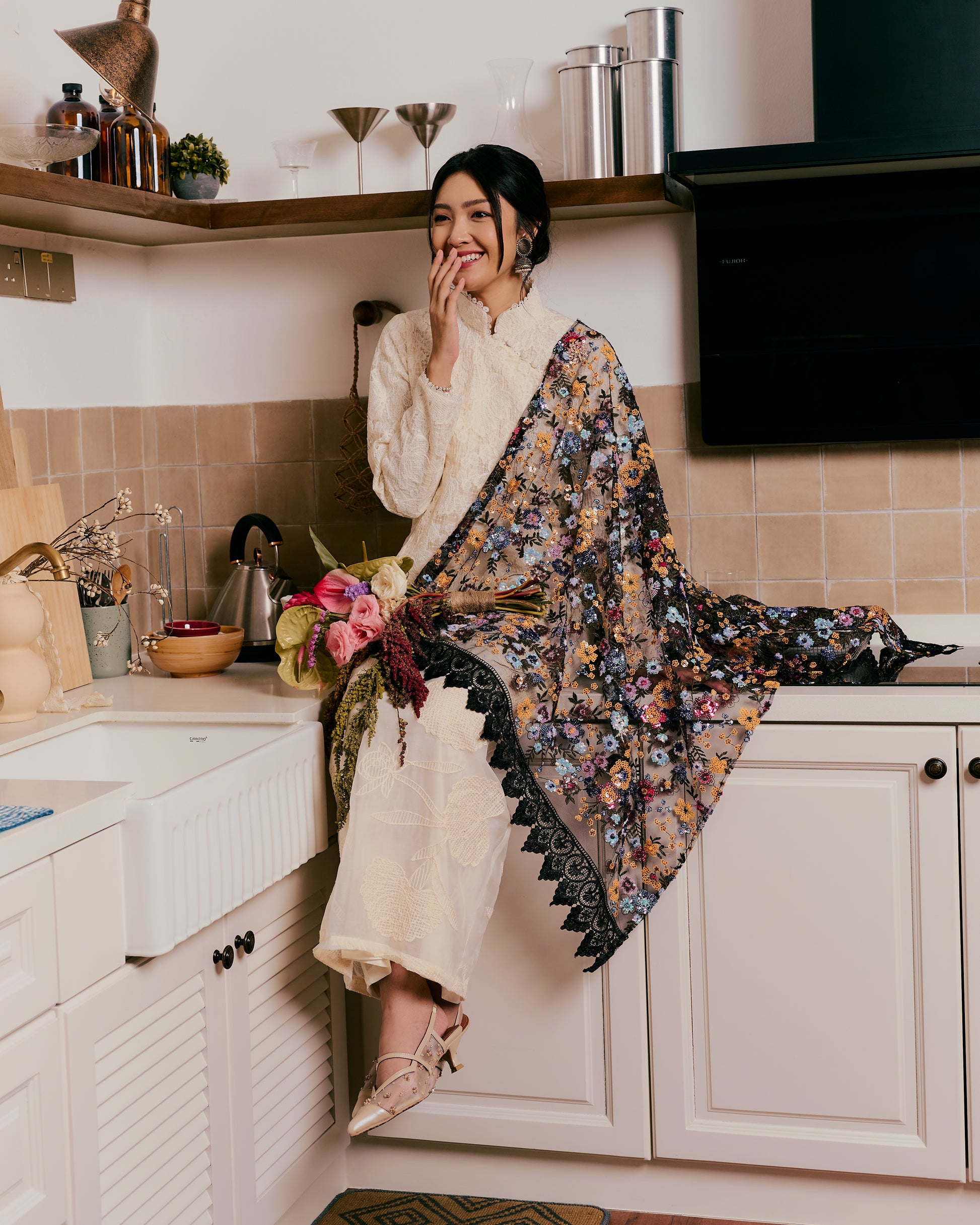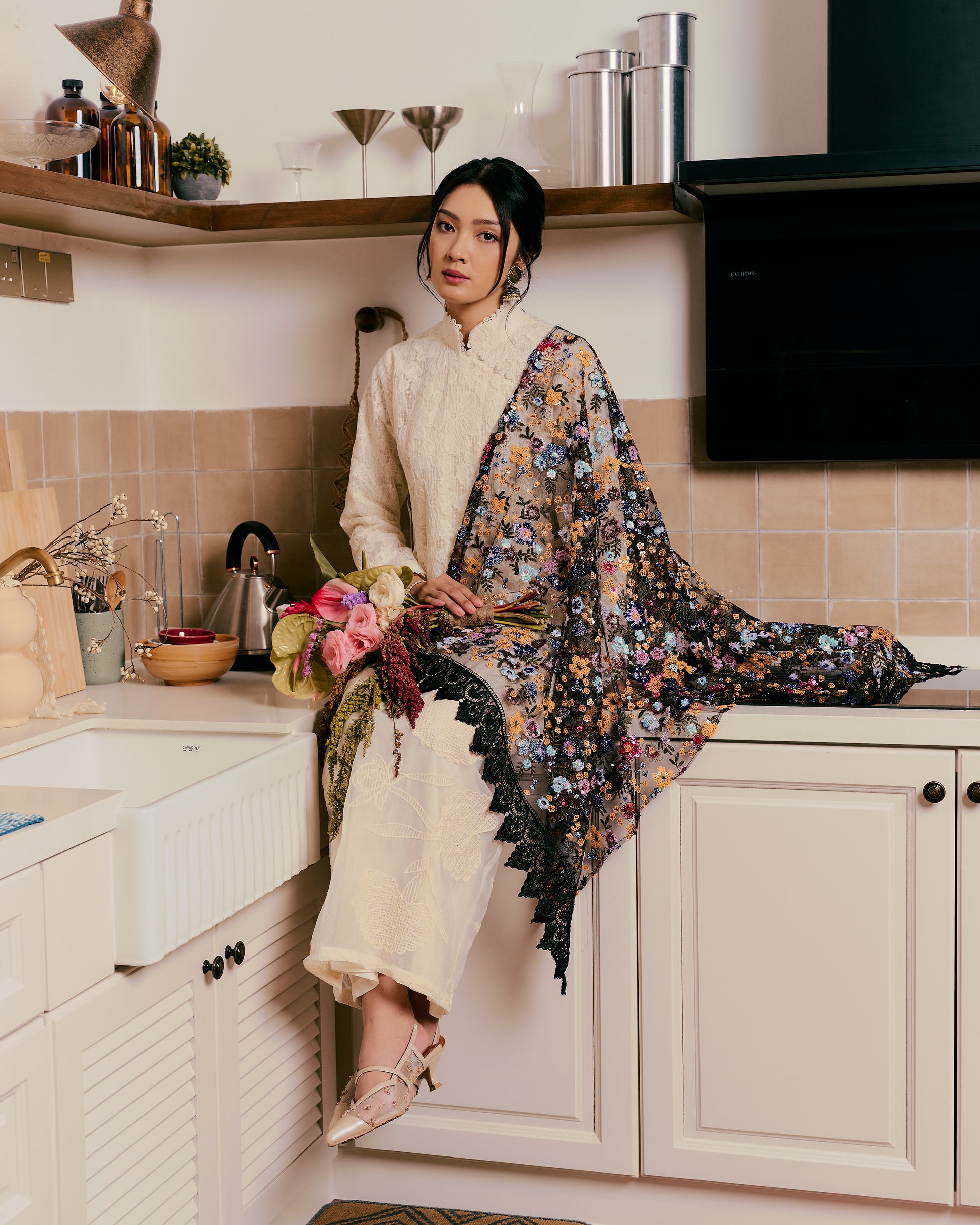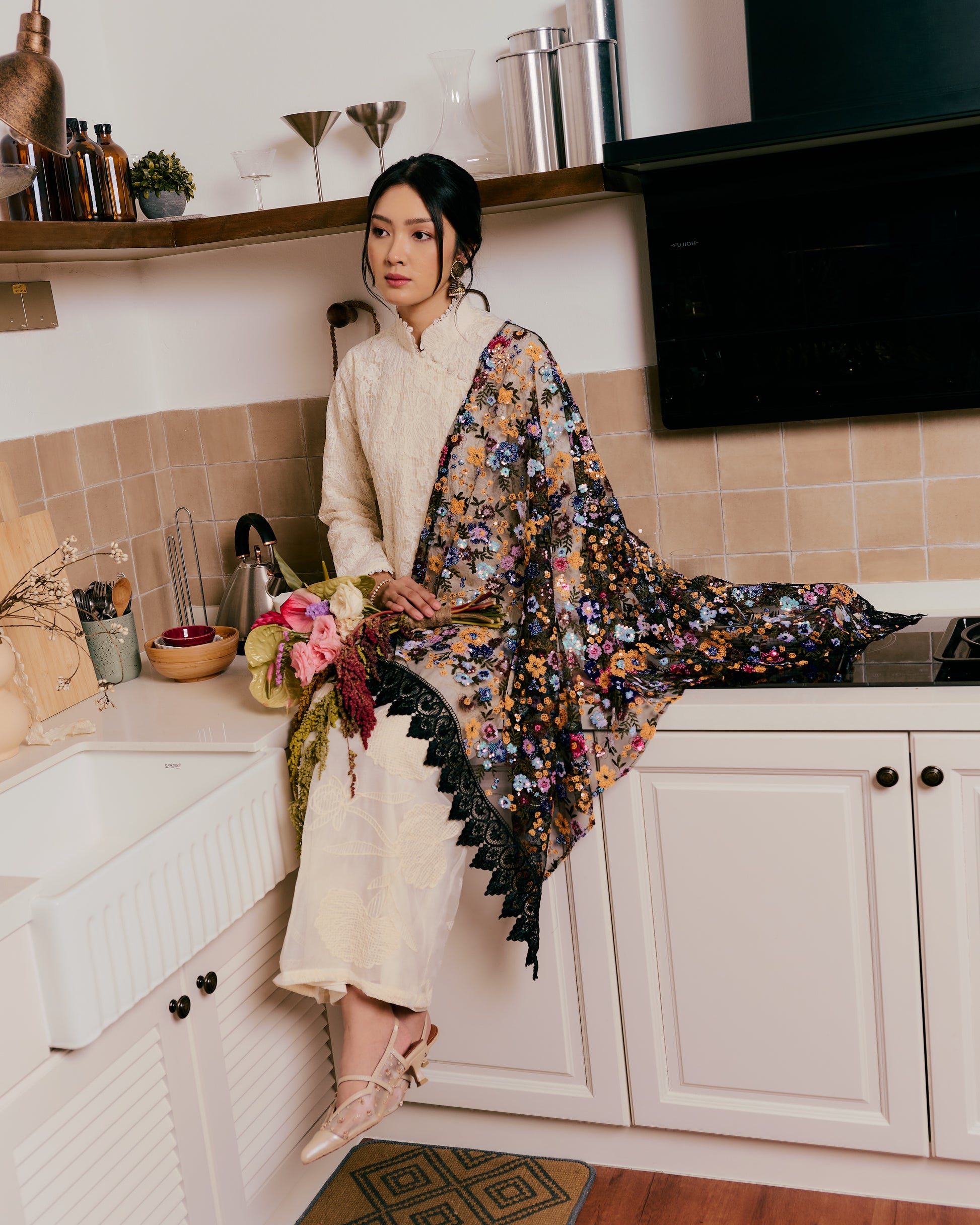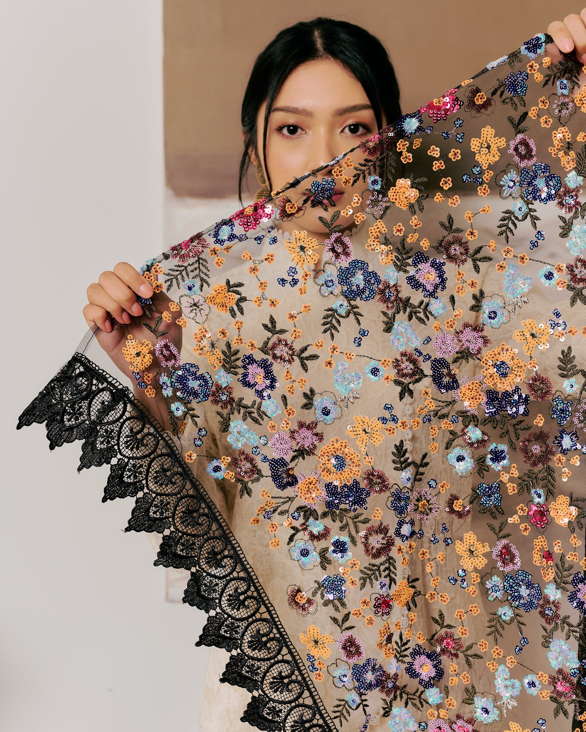 An ode to quiet elegance, this selendang is crafted from delicate sequin fabric, adorned with intricate multicoloured floral embroidery that blooms gracefully across its surface.